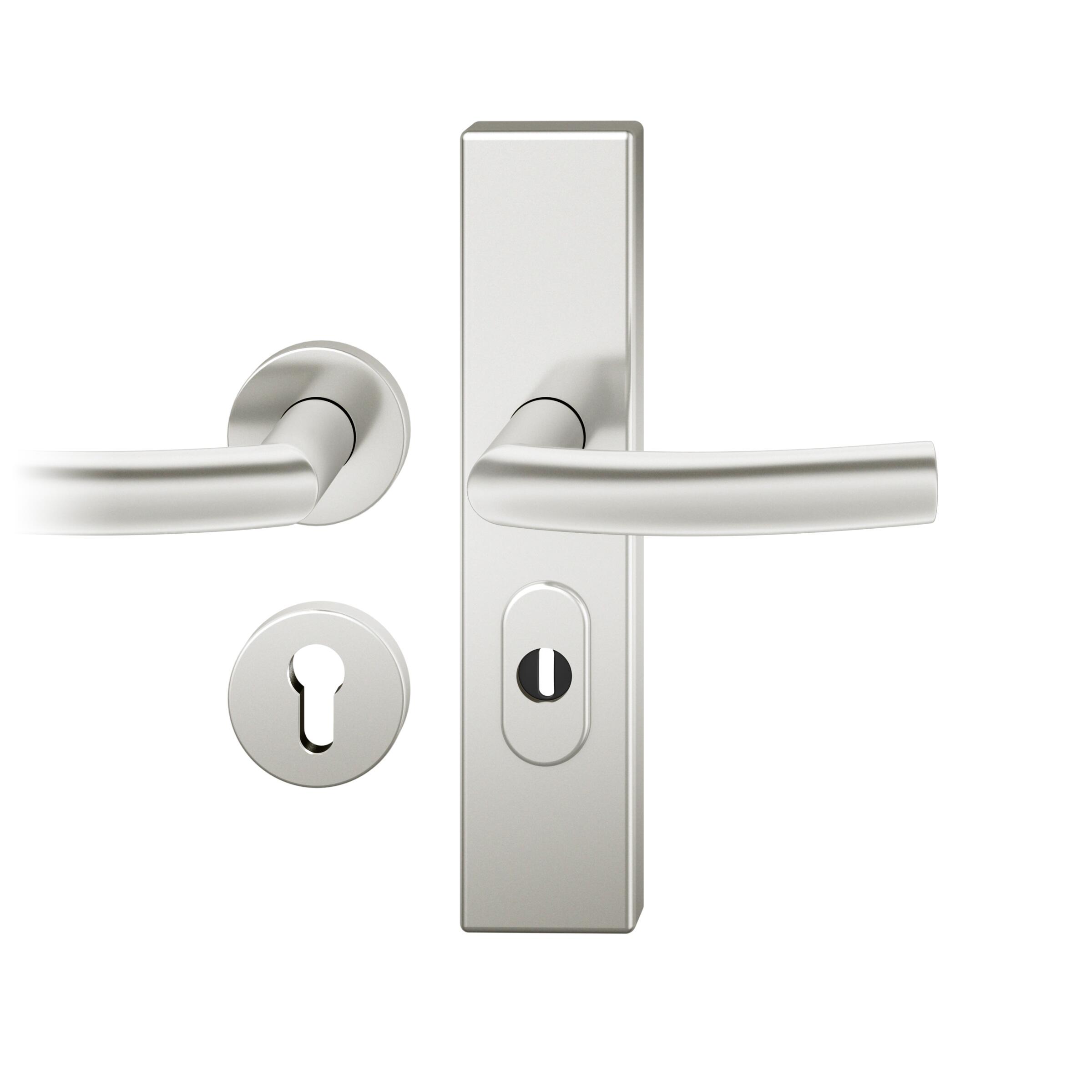Startseite Türbeschläge FSB Sicherheitsbeschläge Druecker-Grt. re PZ 72mm Ros.S2 | Langschild ZA. Stift 8mm | Innenseite Rosette |Aluminium naturfarbig