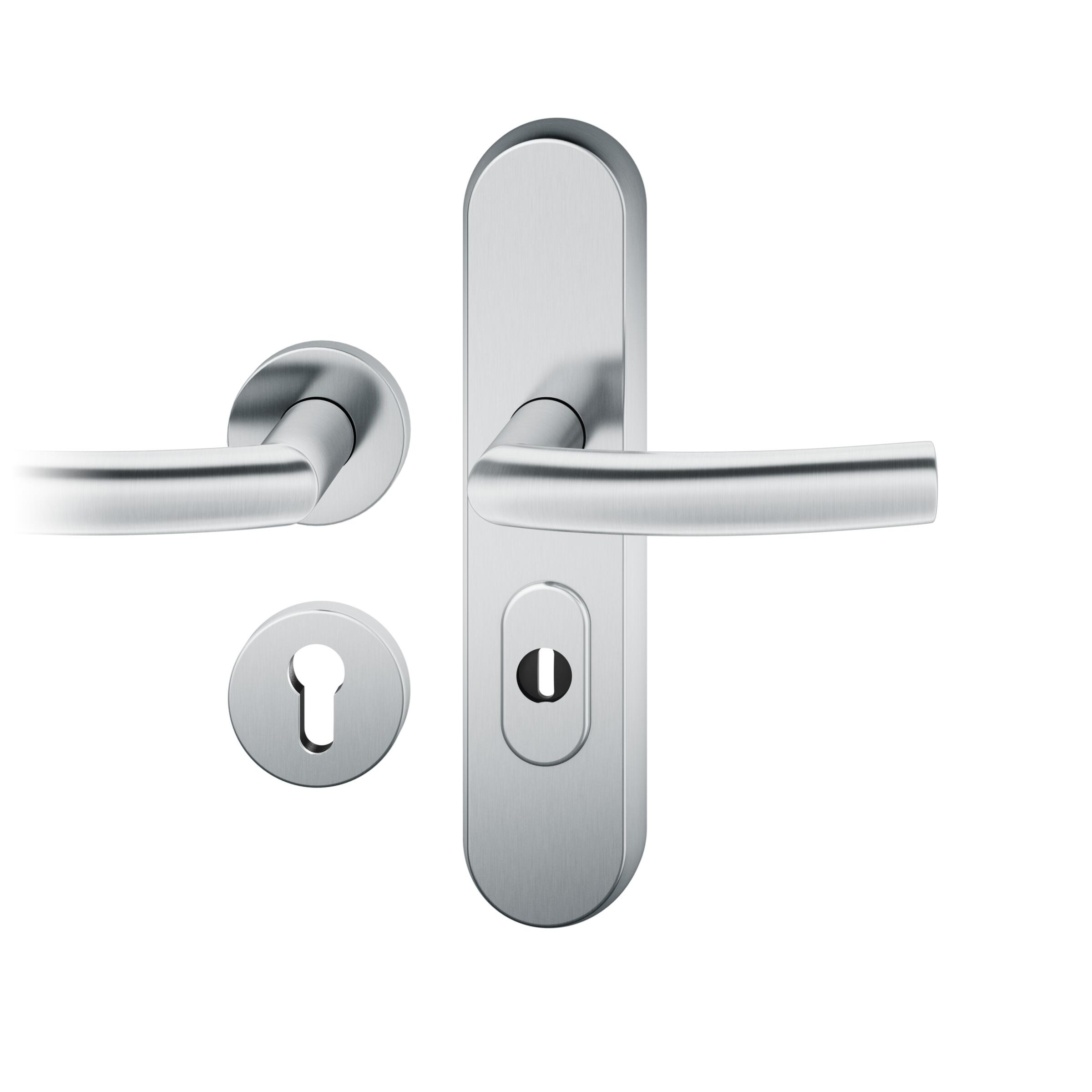 Startseite Türbeschläge FSB Sicherheitsbeschläge Druecker-Grt. re PZ 72mm Ros.S2 | Langschild ZA. Stift 8mm | Innenseite Rosette |Edelstahl fein matt