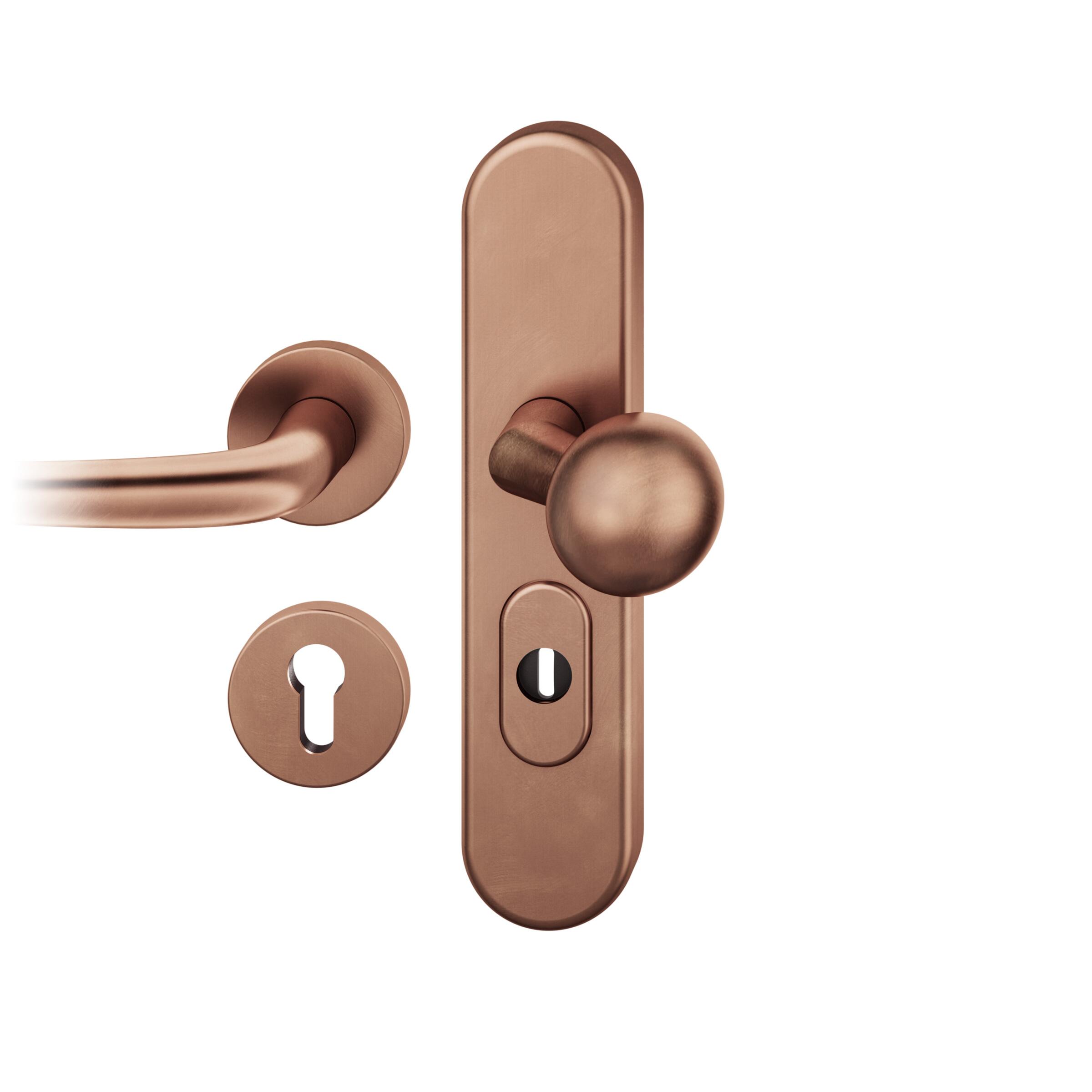 Startseite Türbeschläge FSB Sicherheitsbeschläge FS-Wechsel-Grt. PZ 72mm Ros.S2 | Langschild ZA. Stift 9mm | Innenseite Rosette |Bronze hell patiniert gew.